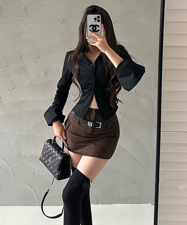 나니 오피스룩 선생님룩 비서룩 배꼽오픈 불규칙 단색 셔츠