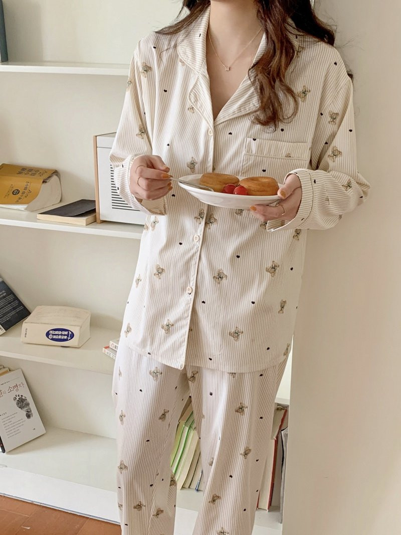 [커플가능🐻🤍] 스트라이프 베어 긴팔 상하세트 파자마
