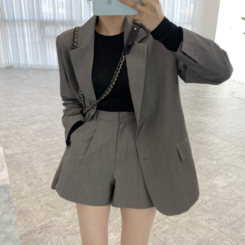 (당일출고/set) 카라 긴팔 하객룩 연말룩 루즈핏 오버핏 데일리 심플 자켓 블레이저 A라인 밴딩 반바지 셋업 수트 투피스 세트 3color