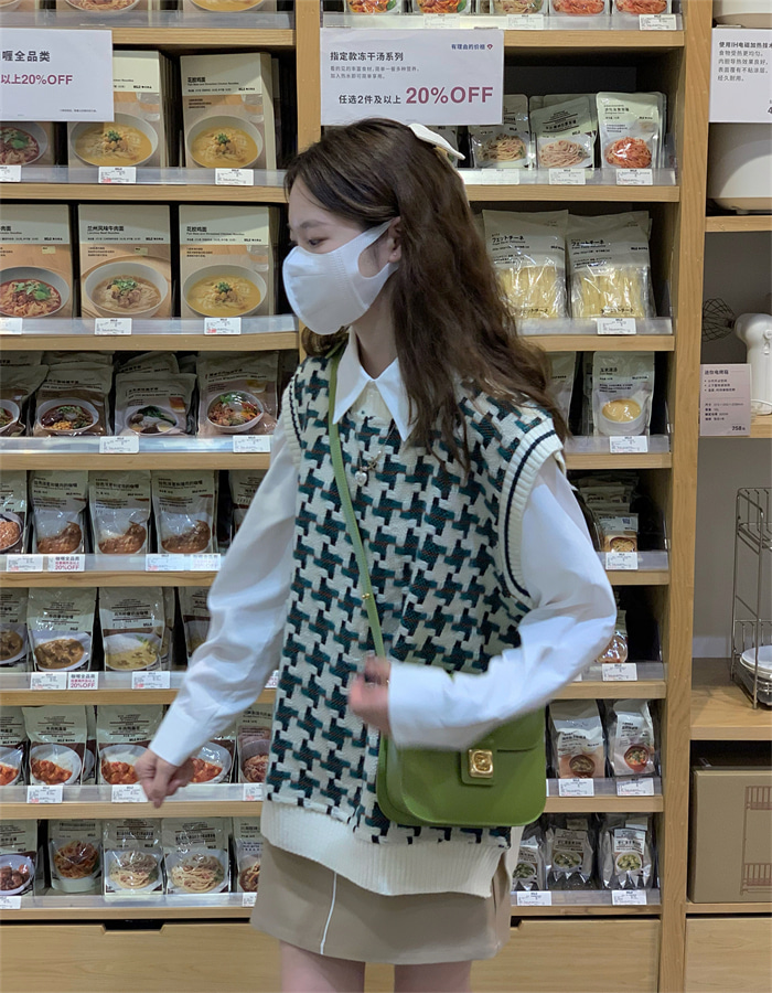 하운드체크 루즈핏 니트 조끼/화이트 와이셔츠 코디세트