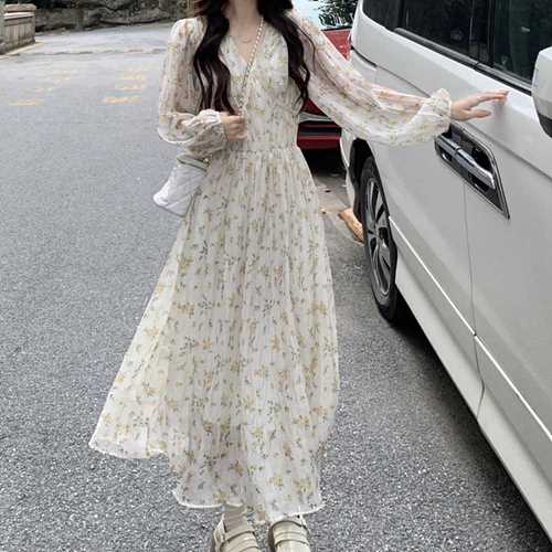 아이보리 꽃무늬 플라워프린트 쉬폰 브이넥 롱 원피스 드레스 J27