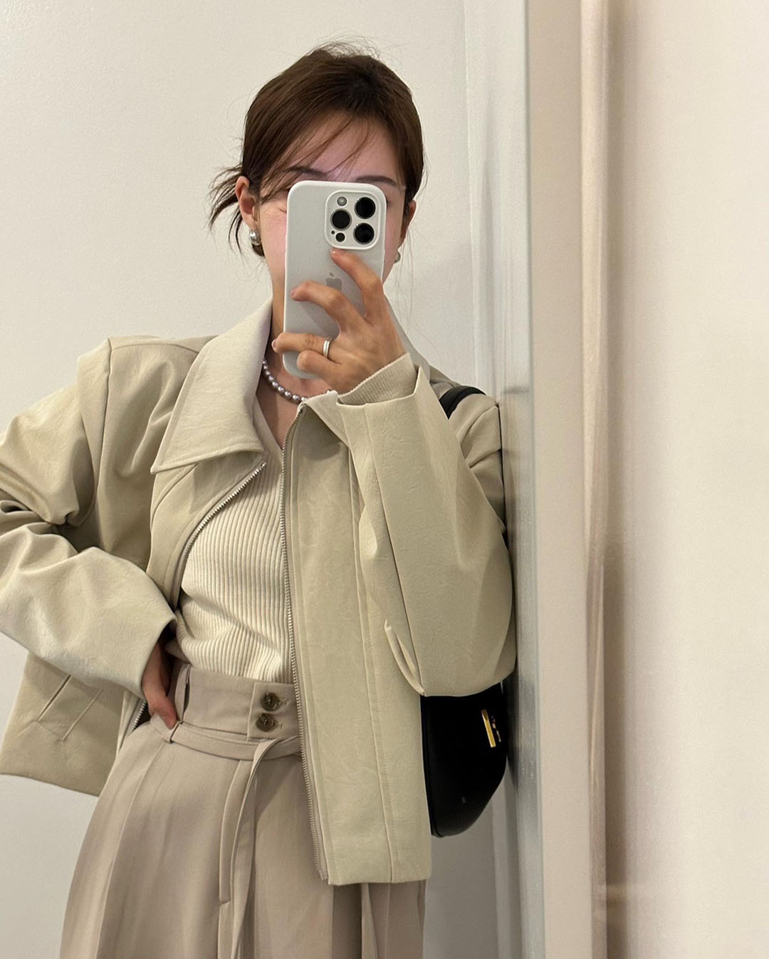 리벳 봄 루즈핏 카라 싱글 크롭 라이더 레더 자켓