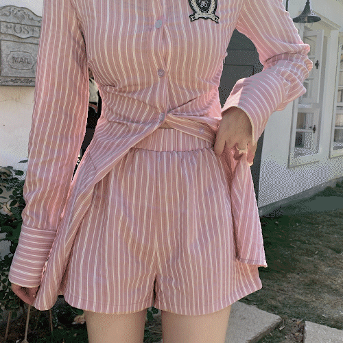 [프레피룩/여름하객룩셋업]스트라이프 핑크 허리잘록 셔츠원피스 반바지 투피스 넥타이세트 줄무늬셔츠 스쿨룩 프레피룩 교복 학생 에버랜드 놀이공원 여친룩