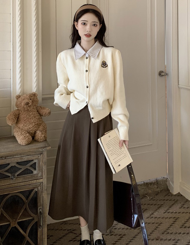 공항패션 공항룩 소녀 카라 니트 가디건/플리츠 롱 스커트 코디세트
