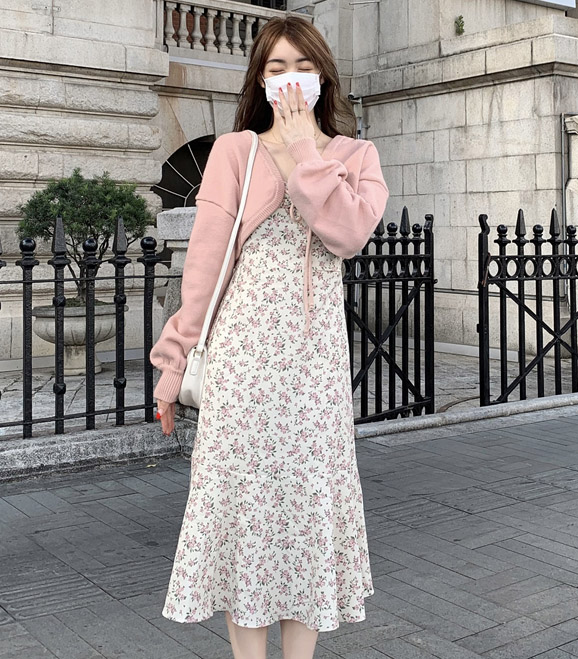 공항패션 공항룩 여친룩 플라워 나시 원피스/살안타템 리본타이 볼레로 니트 가디건 코디세트