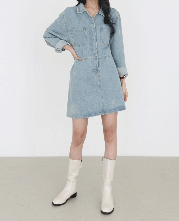 [자체제작] 터치 아웃포켓 데님 긴팔 숏 미니원피스 (1color)