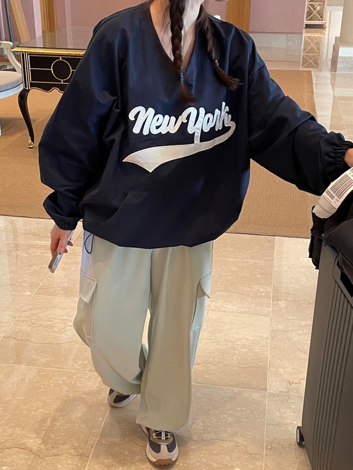 🚀오늘출발[오버핏/간절기에딱] 나일론 뉴욕 브이넥 바스락 스트링 맨투맨-5color