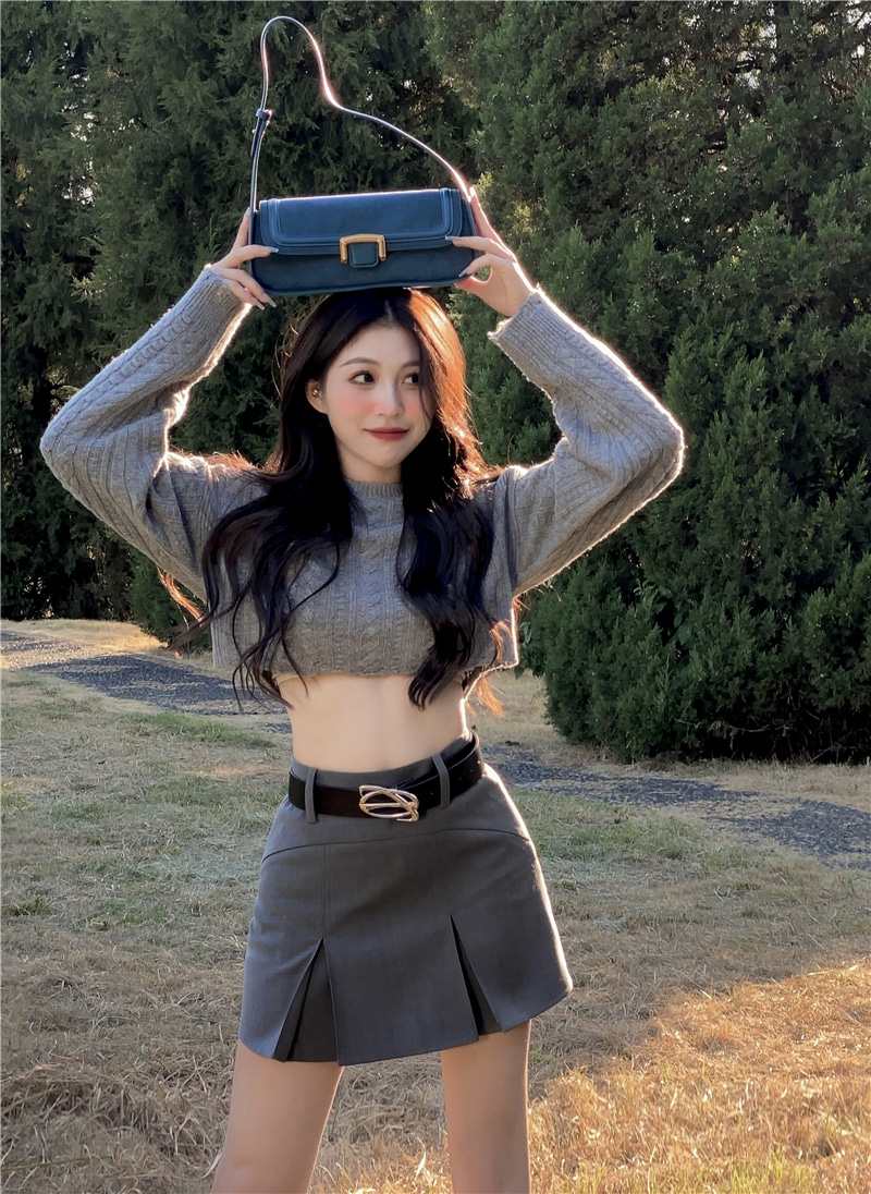 라운드넥 크롭 니트 티셔츠/주름 절개 미니 스커트 코디세트