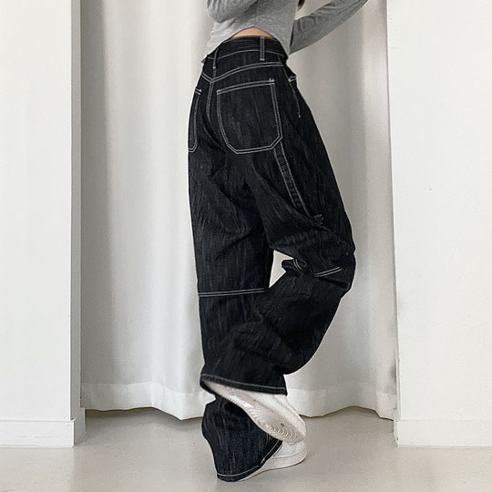 [유니크/와이드핏] 힙한 포인트, 끈 스티치 화이트 흑청 생지 와이드 데님 팬츠 2color] 쿠키와이드팬츠