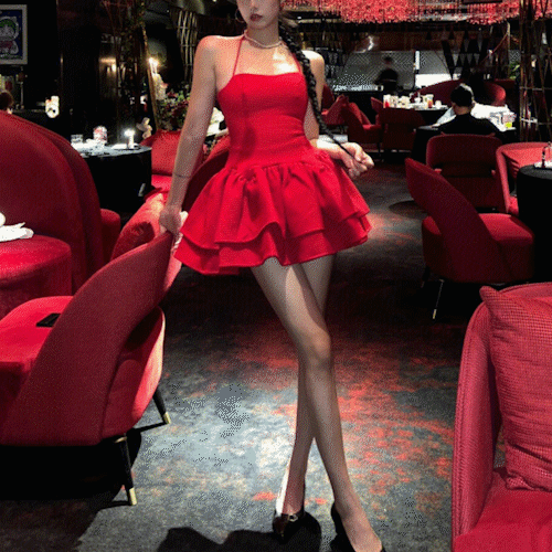 [여름신상/여름원피스]섹시 튜브탑 나시 레드원피스 장미꽃 프릴 캉캉치마 미니스커트 빨간 드레스 비치 해변 피크닉 파티 연말룩 호캉스 a라인 요루 미니원피스