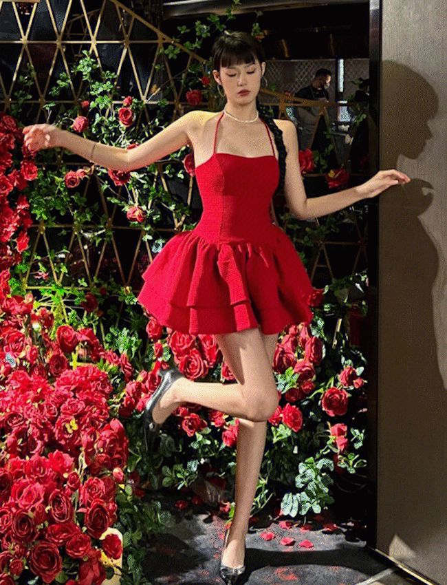 [여름신상/여름원피스]레드 튜브탑 끈 나시 숏원피스 러블리 플라워 캉캉치마 서스펜더 빨간 장미 미니드레스 비치 해변 피크닉 파티 호캉스 촬영 a라인 프릴 꽃원피스