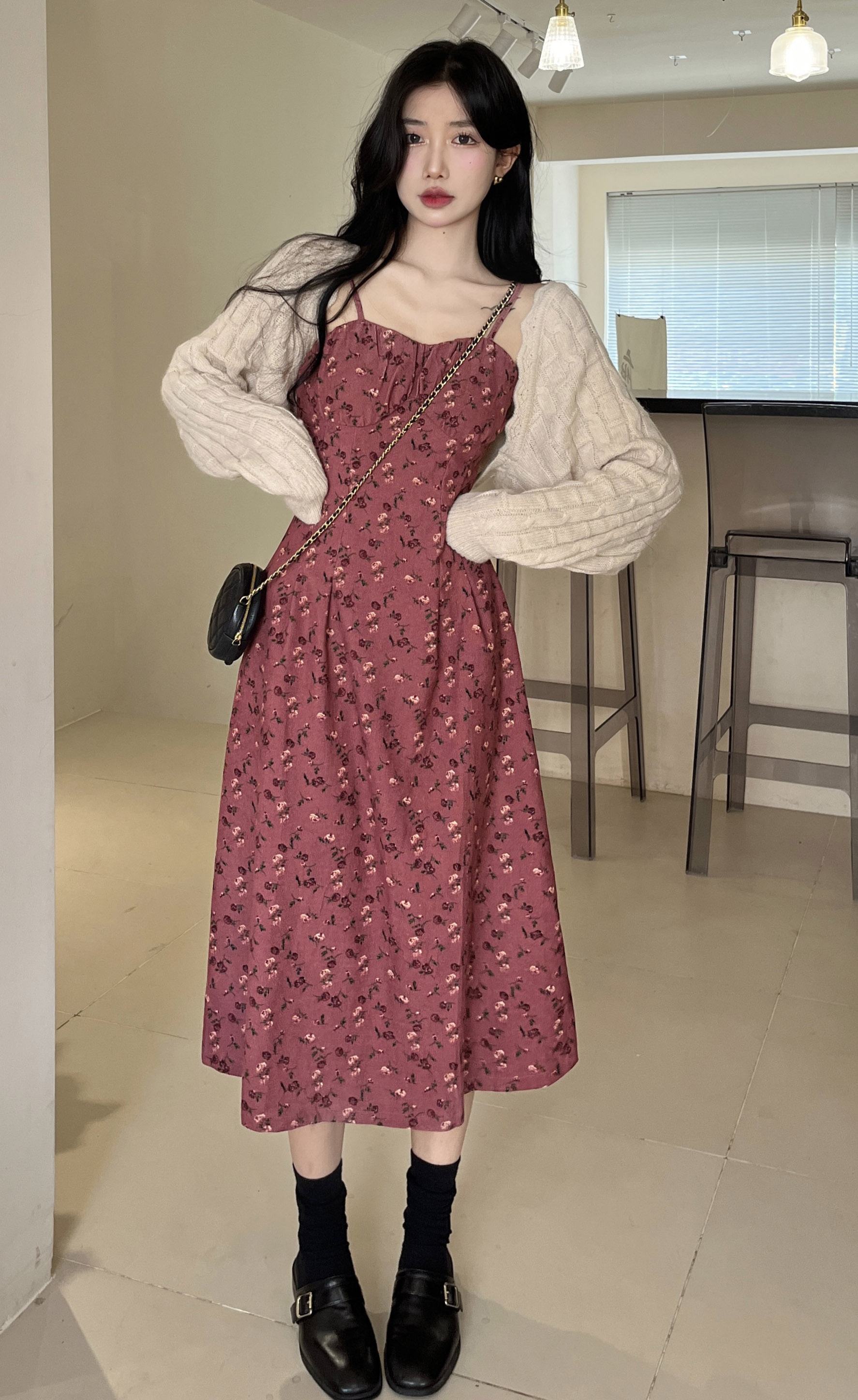 공항패션 공항룩 니트 볼레로 가디건/꽃무늬 서스펜더 원피스 코디세트