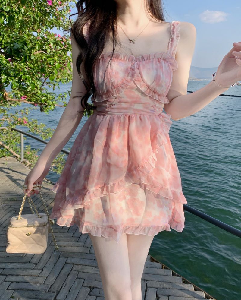 해변 휴가 꽃무늬 프릴 미니 원피스