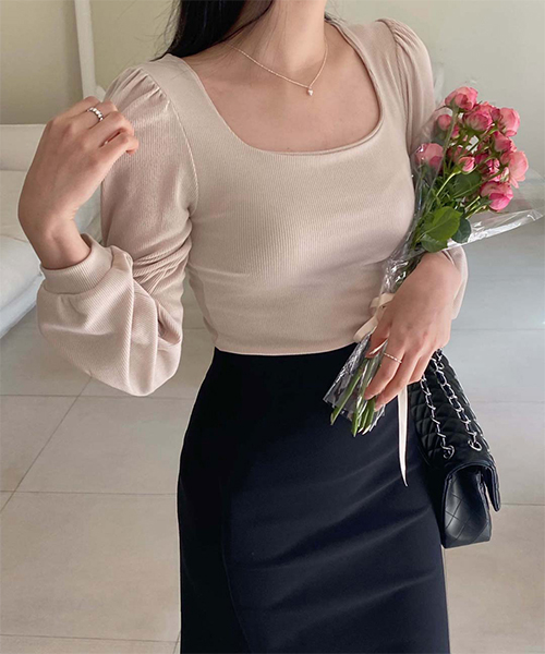 MADE 레나 스퀘어넥 골지 퍼프 티셔츠