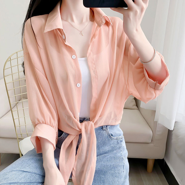 여성 시스루 쉬폰 블라우스 7부 묶는 셔츠 매듭 봄 여름 가을
