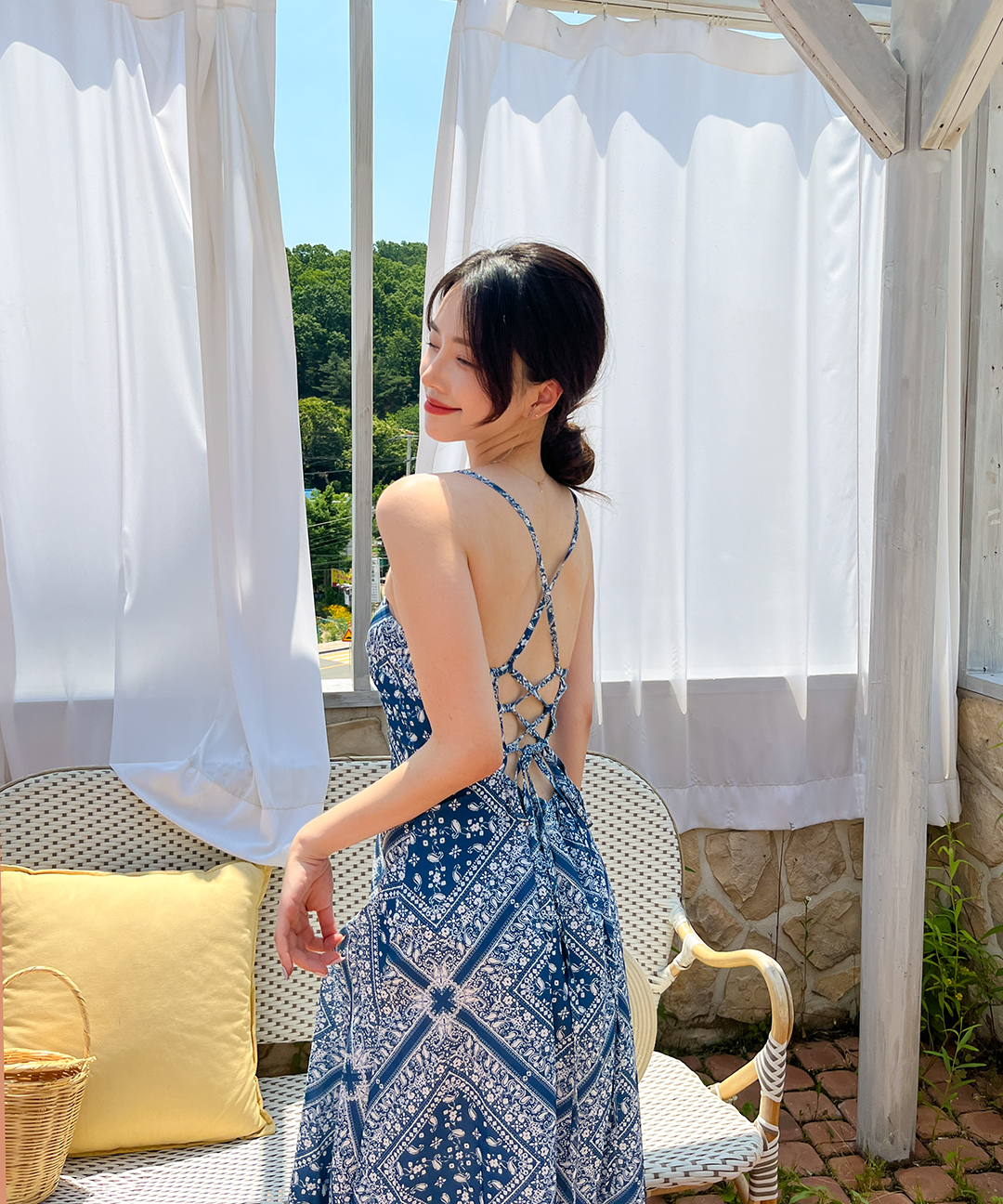 [44-55] 백리스 페이즐 에스닉 나시 원피스 (패턴/뷔스티에/롱원피스/백트임/블루/스트랩/시원한)
