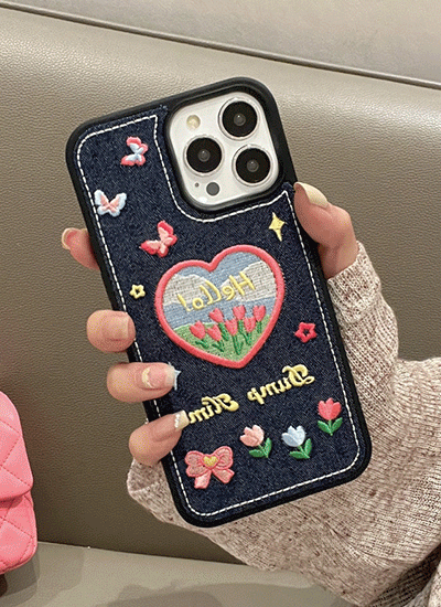 빠른출고ෆ⸒⸒ 헬로우 데님 청 자수 아이폰케이스