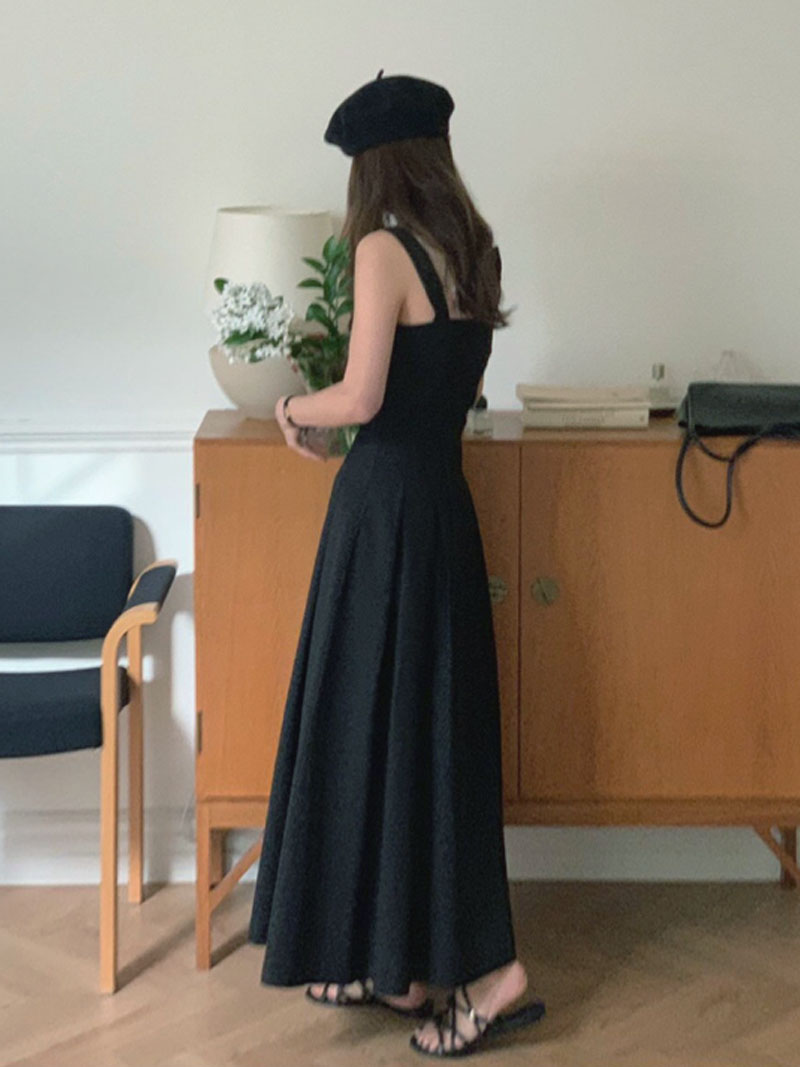 뷔스티에 핀턱 플레어 롱 원피스 (크림 블랙)