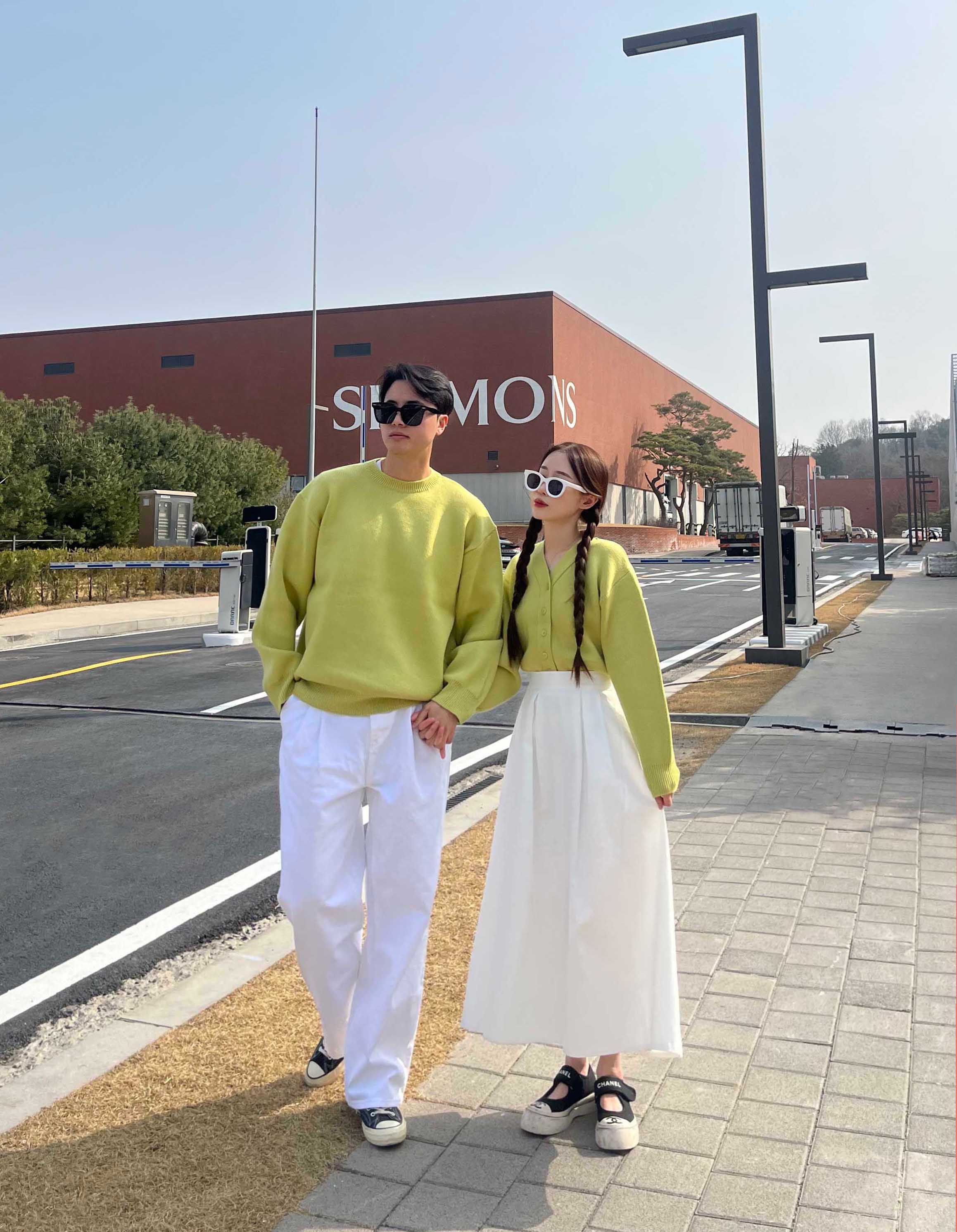 [브랜드퀄/4컬러] 2사이즈 남녀공용 커플룩 초고퀄 크롭 가디건 봄 니트 롱스커트 코튼 팬츠 세트 시밀러룩 봄 가을 데일리 데이트룩