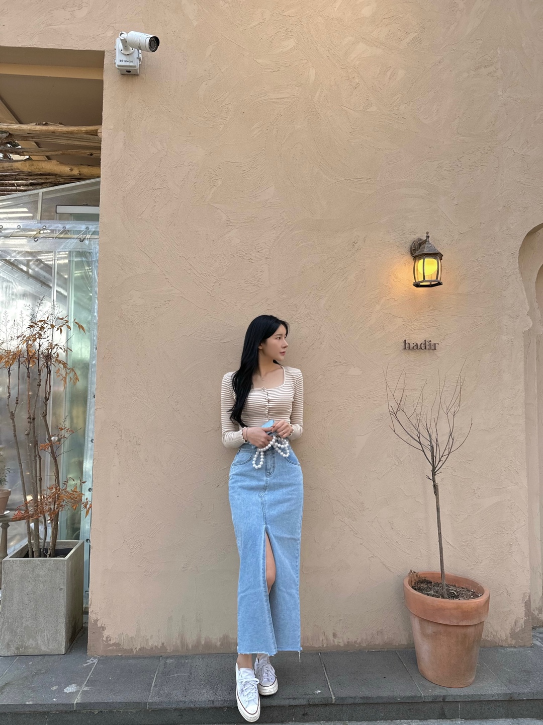 트임 롱 데님 스커트 하이웨스트 청치마 연청 봄 가을 여름 간절기 코디세트 키큰여자