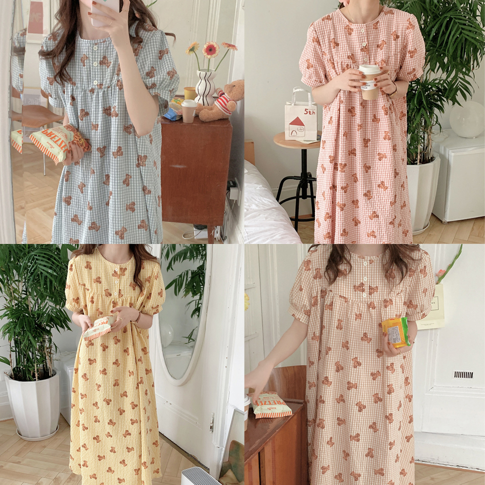 체크 곰돌이 반팔 원피스 잠옷 순면 코튼 빅사이즈 롱 원피스 부모님 가족 파자마