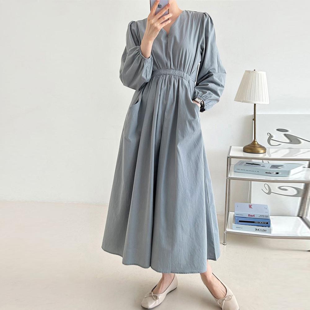 셔링 밴딩 롱 플레어 소라색 하늘색 원피스