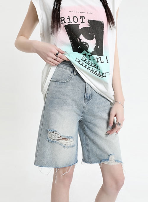 여름 시원한 디스트로이 진 하이웨이스트 레트로 헤진 바지 데님 반바지 엉덩이한 락 포인트 팬츠 워싱 연청 물빠진 청반바지