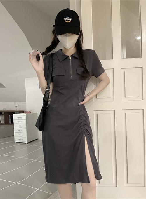 슬릿 드레스 스포티한 데일리 편안한 캐주얼한 엉덩이한 디자인 원피스 스커트 집업 카라 셔링 주름 앞트임 허벅지 라인 반팔 원피스