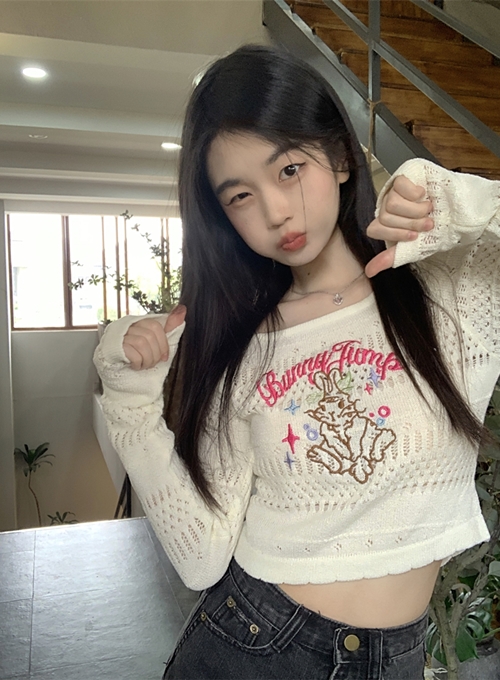 하이틴 레트로 디자인 뉴트로 아이돌 크롭티 롱슬리브 니트 크롭니트 귀여운 넓은 어깨 자수 니트 버니점프 사랑스러운 디자인