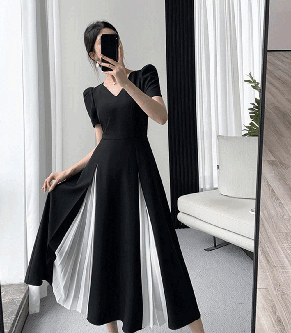 [MD 강추!!엘리트 클래식 햅번 스타일 원피스] 2부웨딩 브라이덜샤워 스몰웨딩 입체장식 슬림 V넥 블랙 여성 드레스!!하객룩 여행룩