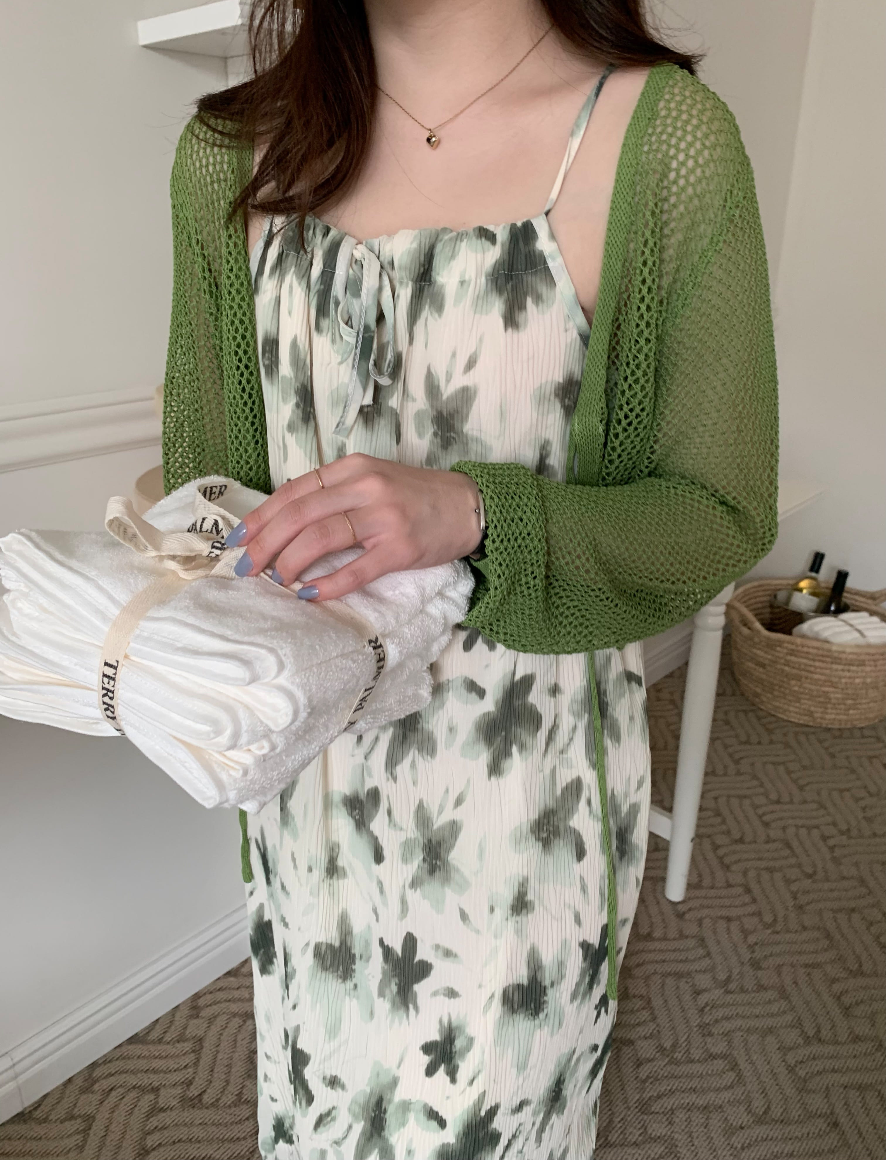 [ 상큼발랄 가디건 원피스 조합 ] 망사 메쉬 루즈핏 롱드레스 끈나시 뷔스티에 레이어드 캐미솔 어깨끈 꽃무늬 플라워 그린 A라인 봄 여름 간절기 30대 40대 여성 여자 레이디 여행 비치 바캉스룩 휴가 리조트룩 휴양지옷 동남아