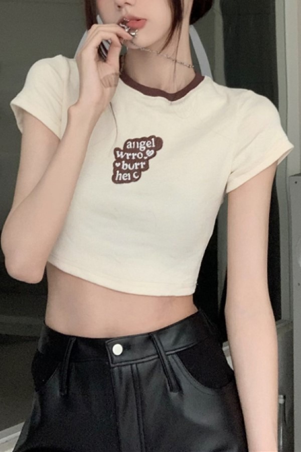 피오 팬 레터링 라운드넥 반팔 크롭 탑