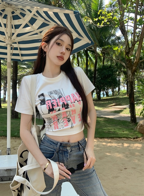프린팅 엉덩이한 카툰 스타일 티 크롭티 유럽 미국 스타일 허리 라인 크롭 배꼽티 슬림핏 꽉맞는 티셔츠 여름 T 일상복