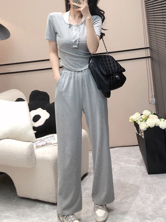 공항패션 공항룩 트레이닝복 반팔 크롭 티셔츠+하이웨스트 밴딩 팬츠 세트