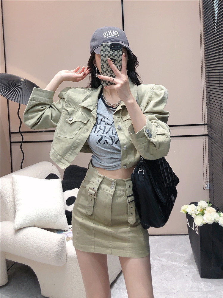 공항패션 공항룩 데님 투피스 크롭 자켓+스트랩 벨트 스커트 세트