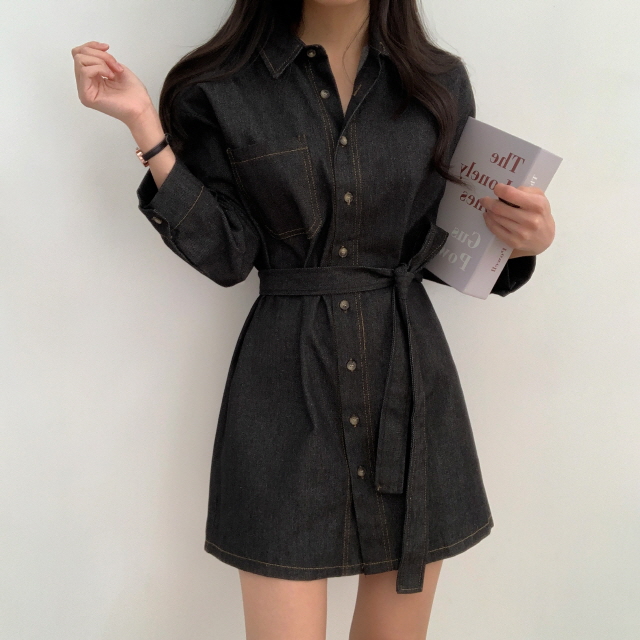 [허리끈 포함!] 스티치 벨티드 데님 셔츠 원피스 2color