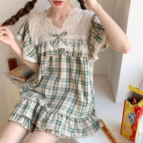 타탄 체크 여름 반팔 프릴 레이스 공주 커플 잠옷 여성 남성 파자마 투피스 세트
