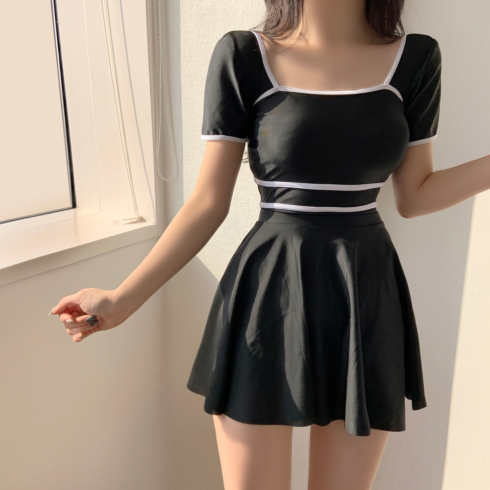 (당일출고) 프렌치 반팔 모노키니 + 스커트 세트 수영복 비키니 2PCS 심플 3가지사이즈 66 77사이즈 빅사이즈 플러스