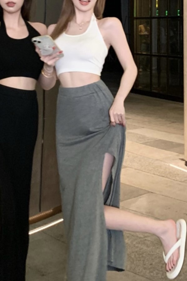 set 베라 홀터넥 민소매 나시 크롭 탑 슬릿 롱 스커트 투피스 세트