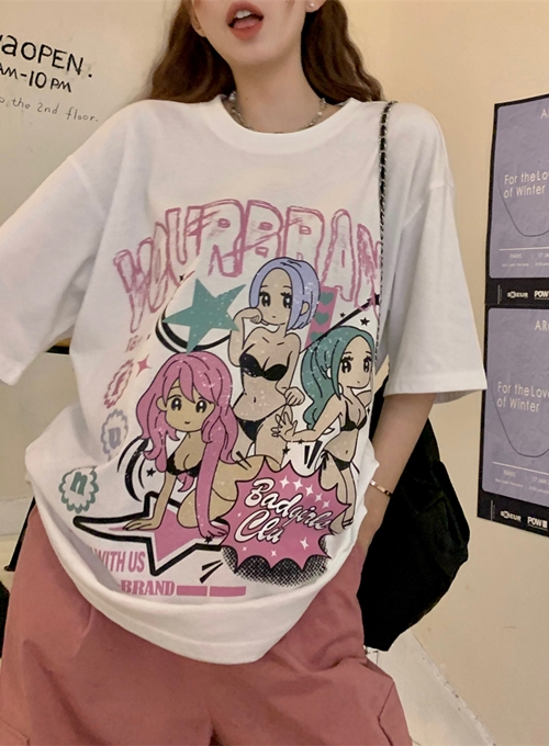 만화스타일 여성 레트로 망가 인쇄 프린트 라운드넥 티셔츠 큰사이즈 여성 탑 캐주얼 일상 루즈핏 엉덩이한 유행 데일리룩