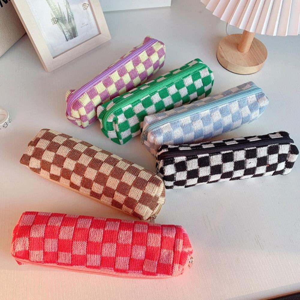 여자 귀여운 체크 필통 볼펜 마스카라 브러쉬 파우치