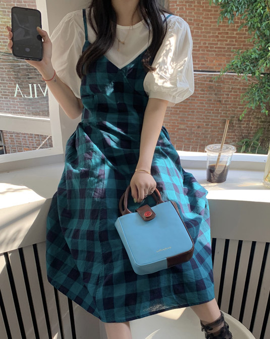 벌룬 소매 블라우스/체크 무늬 나시 원피스 코디세트