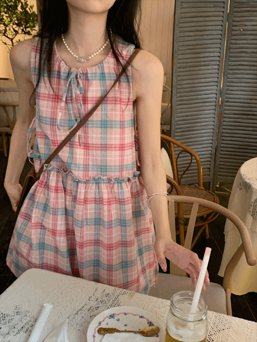 러블리 체크 베이비돌 미니원피스 스트랩 셔링 프릴 라운드넥 민소매 데이트룩 여친룩 바캉스룩