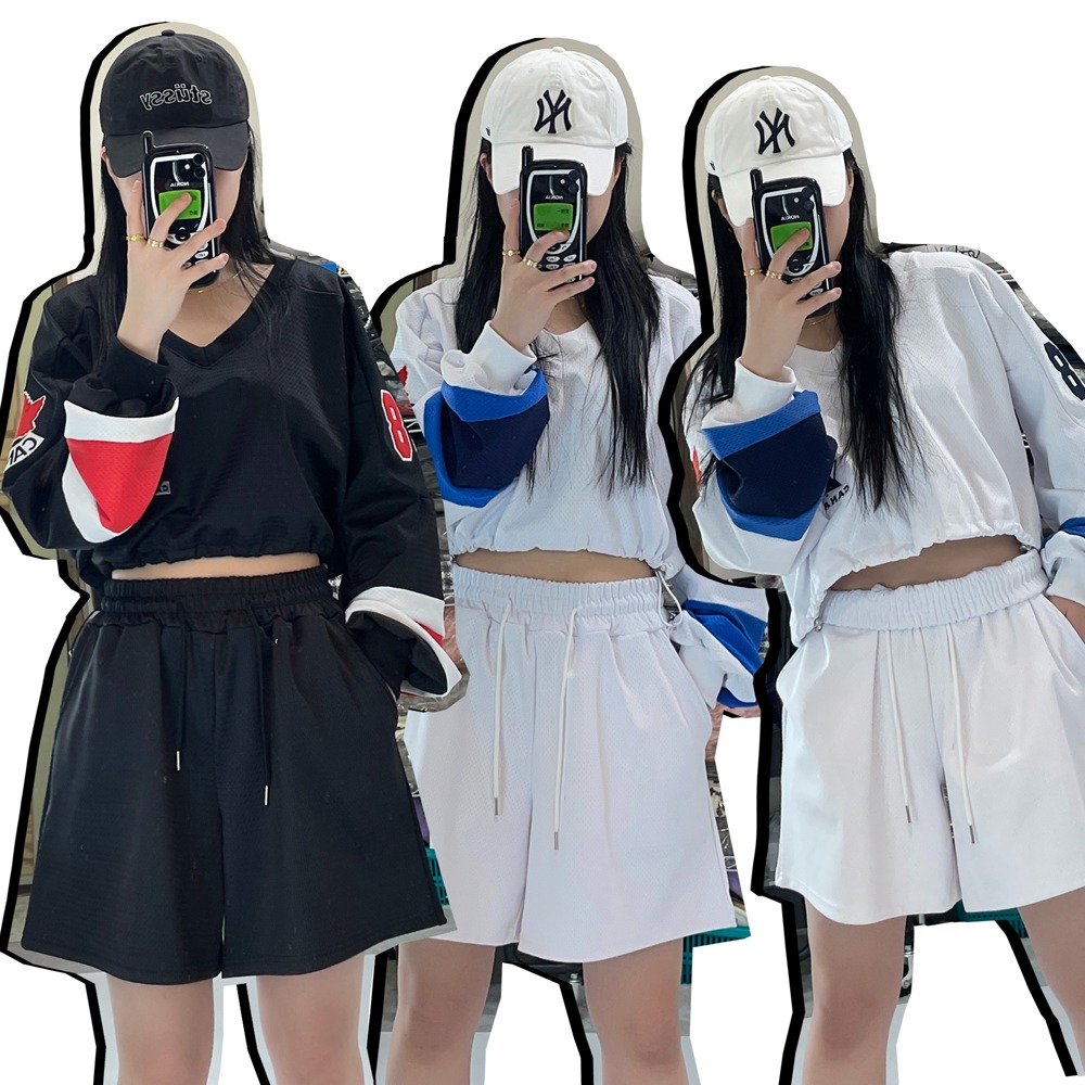 럭비 자수 배색 메쉬 크롭티 반바지 트레이닝 세트