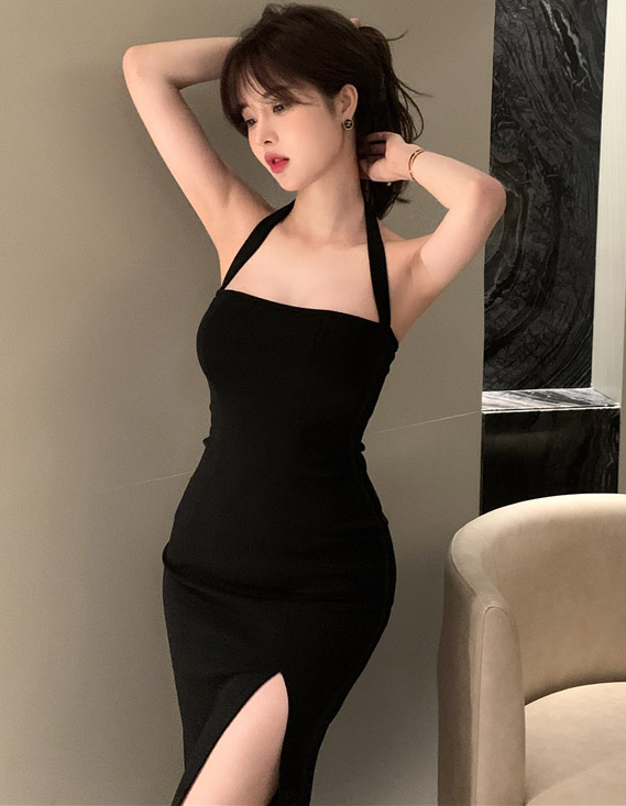 파티룩 백오픈 홀터넥 슬릿 드레스