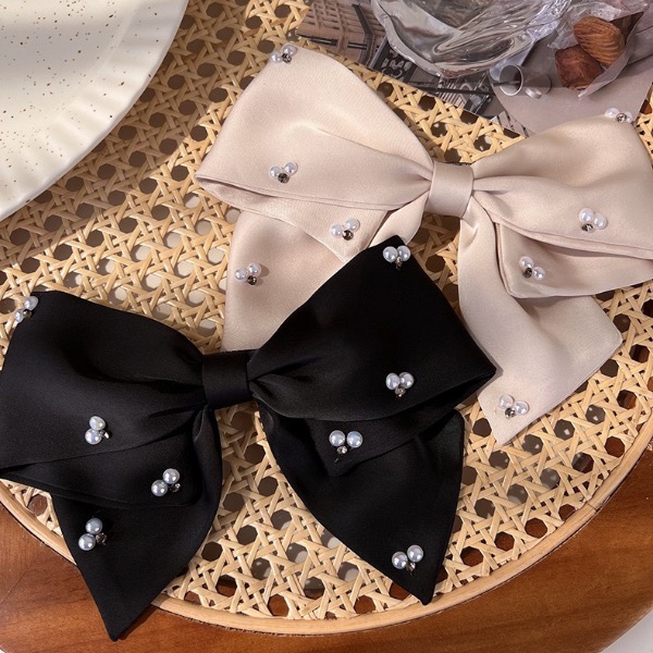 메이 새틴 패브릭 진주 포인트 빅 리본 스프링클립 헤어핀