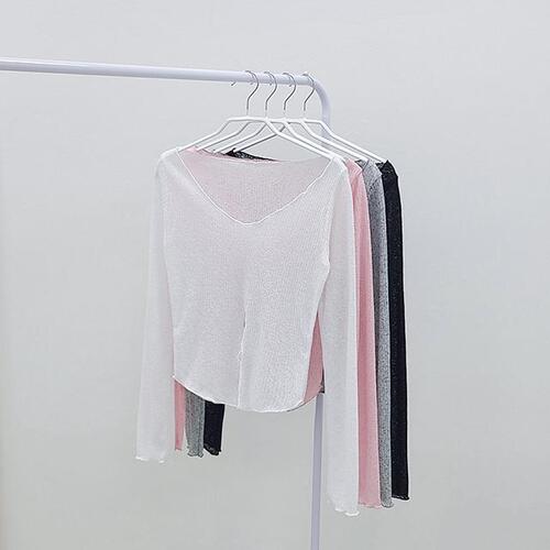 [섹시/유니크/힙/레이어드룩] 일랑 브이넥 시스루 물결 언발 슬림핏 트임 니트 긴팔티