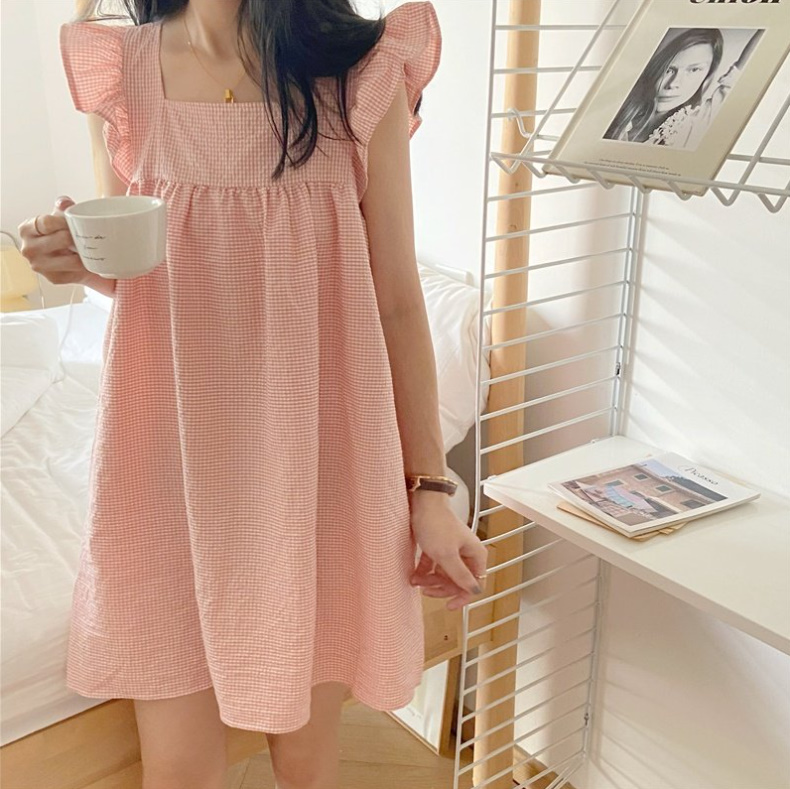 23신상 나시 잔고방원피스 파자마 잠옷 (데일리 홈웨어 프릴 잔체크 스퀘어넥 ) - 소라, 베이지, 핑크