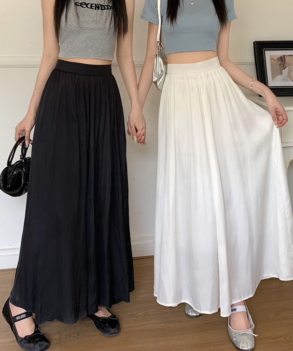 하이웨스트 셔링 플레어 단색 무지 무광 새틴 롱 스커트 / 깔끔한 심플 베이직 얇은 긴치마 검정치마 차르르 편한 봄 여름 데일리룩 캐주얼