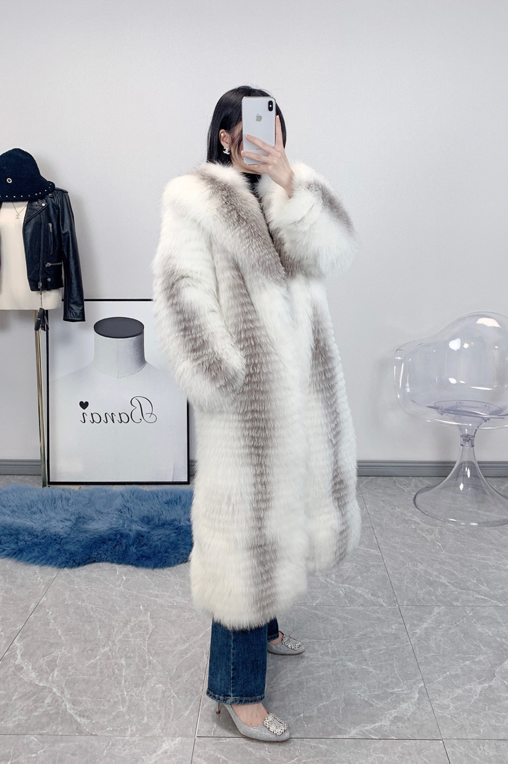 [바나이 BANAI] 리얼 폭스퍼 코트 수공예 절개디자인 천연 화이트컬러 롱코트